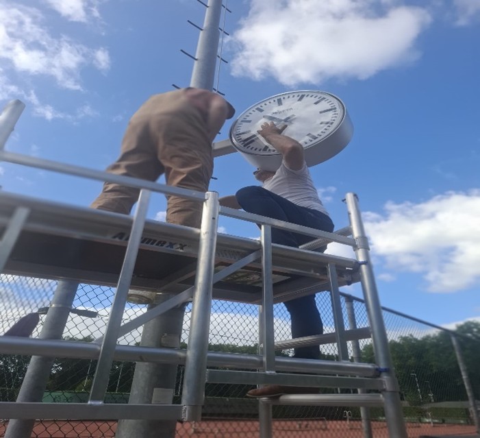 Plaatsing van de klok was geen sinecure. Hier speelt Arjen voor Atlas. Maarten van Grinsven smeedde de bevestiging.